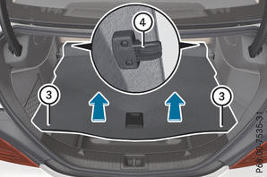 Chwycić podłogę bagażnika z boku 3 i nacisnąć w kierunku strzałki, aż zablokuje się w zaczepie 4.