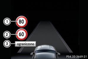 Gdy asystent znaków drogowych po minięciu znaku zakazu wjazdu rozpozna jazdę w kierunku przeciwnym do nakazanego, w zestawie wskaźników wyświetlane jest ostrzeżenie 1. Dodatkowo słychać wtedy sygnał ostrzegawczy. W celu uniknięcia zagrożenia własnego i innych uczestników ruchu należy natychmiast skontrolować kierunek jazdy.